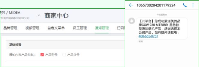 ▲用户激活、信息通知里面产品名称可以在后台设置为型号或者货号。