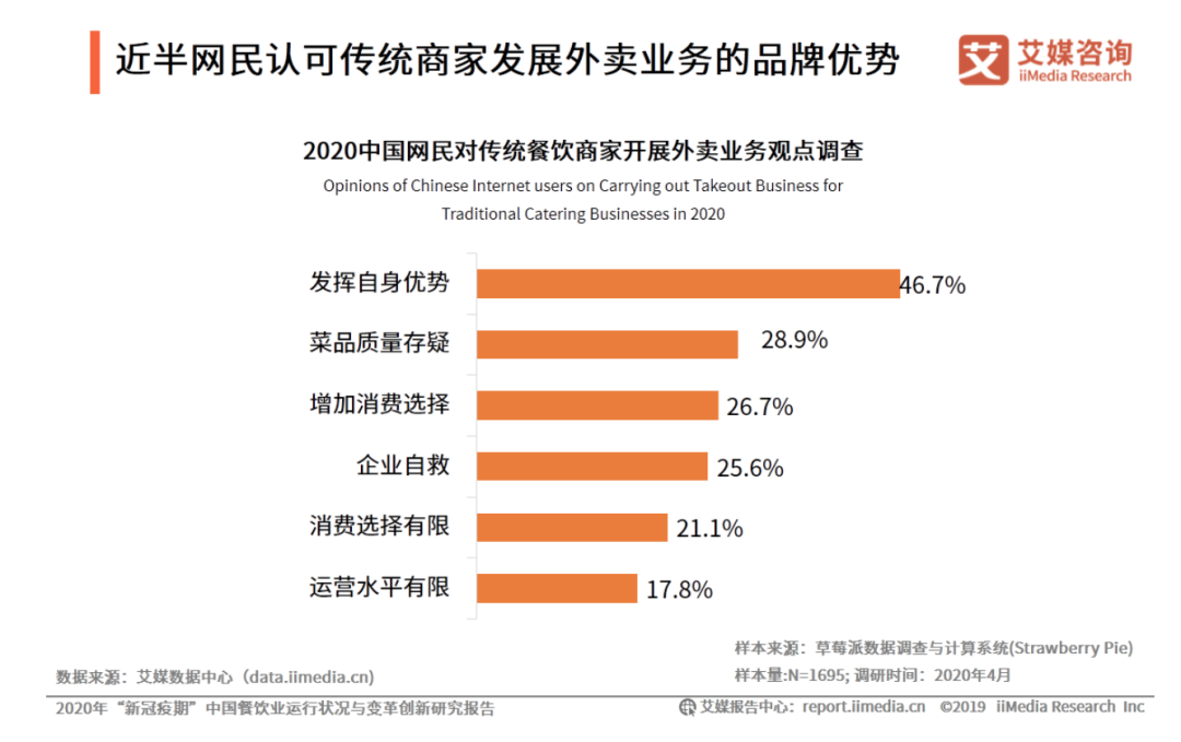 传统模式的餐饮业不用担心突然转型客户会难以接受,iiMedia Research(艾媒咨询)数据显示,46.7%的受访网民认为传统餐饮商家开展线上外卖业务可以发挥自身在品牌知名度、消费群体方面的优势。
