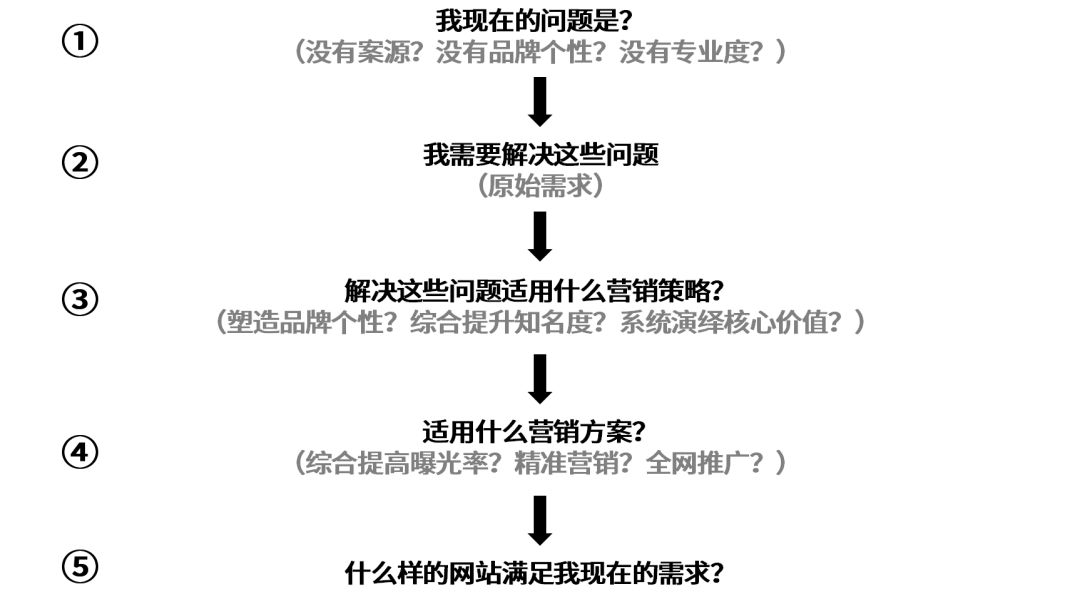 正确的思考思路。很多律师可能思考了①,就直接到⑤,是个捷径,但②③④其实更能帮助自己找到最适合的营销方法▼