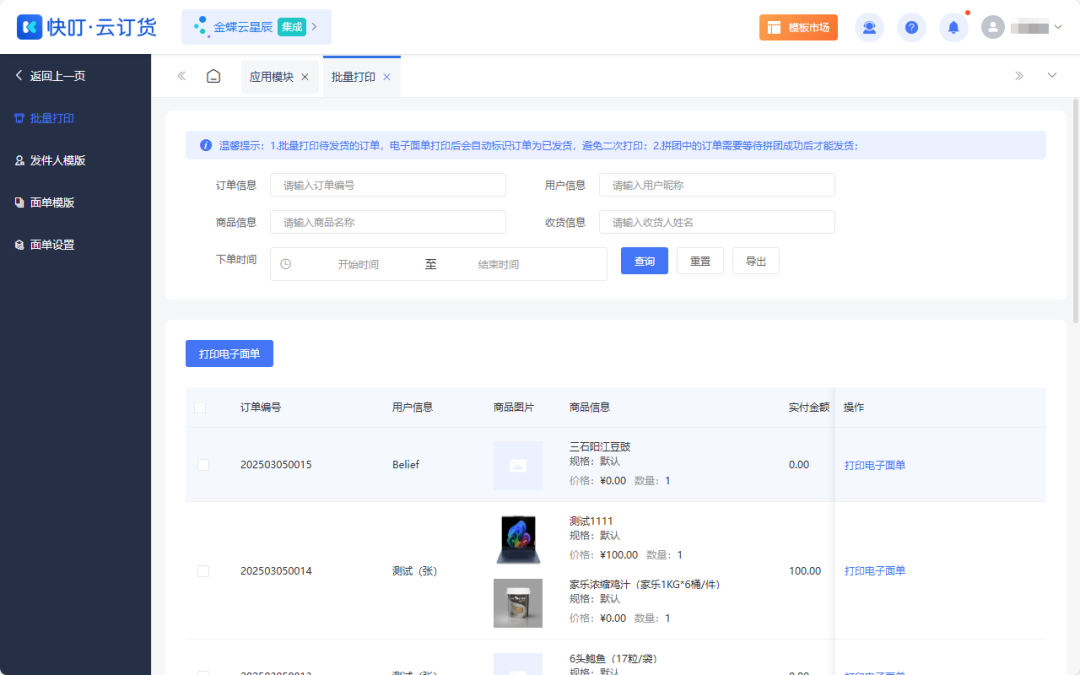 快叮·云订货与快递 100 对接后,发货效率大幅提升。工作人员可在系统中批量打印快递面单,无需逐个联系快递网点下单。揽件信息能够实时同步给快递员,减少沟通成本,加快包裹揽收速度。客户可以在商城直接查看快递轨迹,随时了解货物运输状态,提升购物体验。